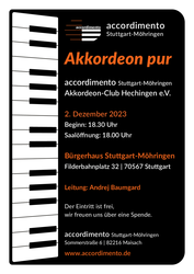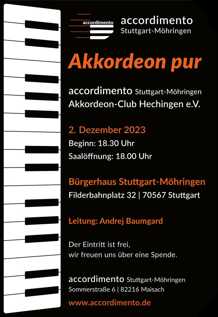 Das Akkordeonorchester accordimento aus Stuttgart-Möhringen lädt zu einem bewegenden und ausdrucks-starken Konzert voller Emotionen ein. Es erklingen sinfonische und dramatische, tänzerische und lyrische Stücke unterschiedlicher Genres und Komponisten.